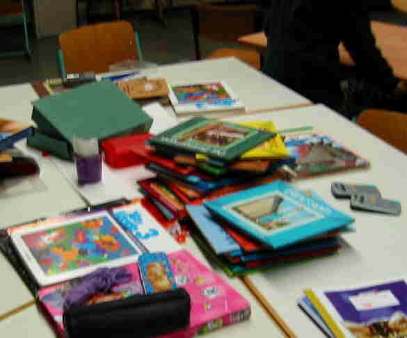 Ich hab Süßigkeiten aus einem Weihnachtspaket auf einen Tisch gelegt. |