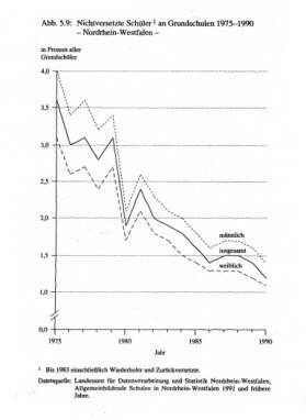 Abbildung 2 (Arbeitsgruppe: Bildungsbericht am Max-Planck-Institut, 1994: S.330) 2.4. Sitzen bleiben In der Grundschule (und anderen) wird in Jahrgangstufen eingeteilt und bei ausreichender Leistung kommen die Schüler mit jedem Jahr auch eine Jahrgangstufe höher. Ausschlaggebend ist dabei das Zeugnis, das die Schüler zweimal im Jahr erhalten. In dem werden sie mit Noten mit von 1-6 (sehr Gut- ungenügend) bewertet werden. „ Bei mehreren mangelhaften oder ungenügenden Leistungen muss ein Schüler eine ganze Jahrgangstufe wiederholen“ (Arbeitsgruppe Bildungsbericht am Max-Planck-Institut, 1994: S.331). Bei Statistiken zu der Allgemeinen „Sitzenbleiberquote“ in Deutschland kann man einen allgemeinen Rückgang erkennen, obwohl es große Unterschiede zwischen den Ländern gibt. Allerdings ist der Rückgang der Sitzenbleiberquote vergleichbar mit dem Rückgang der Schülerzahlen. Außerdem werden wieder Unterschiede zwischen Jungen und Mädchen deutlich, wobei die Mädchen insgesamt weniger sitzen bleiben. Die Unterschiede sind umso größer, wenn auch die Sitzenbleiberquote ansteigt. Dies folgt aus der Abbildung 3 für NRW. Im dargestellten Zeitraum der Grafik sind auch entscheidende Veränderungen erfolgt, die das Sinken der Sitzenbleiberquote gefördert haben. Beispielsweise wurde die Regelversetzung, in manchen Bundesländern, für die erste und oft auch zweite Klasse eingeführt. Zusätzlich wurde auch in der ersten und zweiten Klasse das Zeugnis durch Beurteilungen ersetzt. Diese Neuerungen waren allerdings nur möglich wegen der zurückgehenden Schülerzahlen, den daraus folgenden kleineren Klassen und somit der Entlastung der Lehrer. Durch die Regelversetzung wurde eine zusätzliche Belastung des Schülers durch Sitzen bleiben, vermieden. Der Schüler hat so mehr Zeit sich an die Schule zu gewöhnen.
