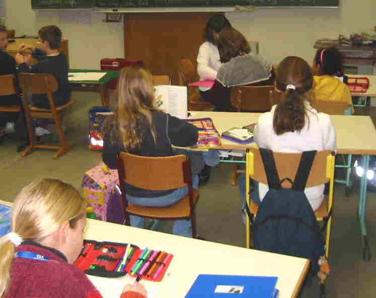 Morgens 7:45 Uhr, eine kleine Erstklässlerin ist im Zimmer der Drittklässler zugelaufen. |