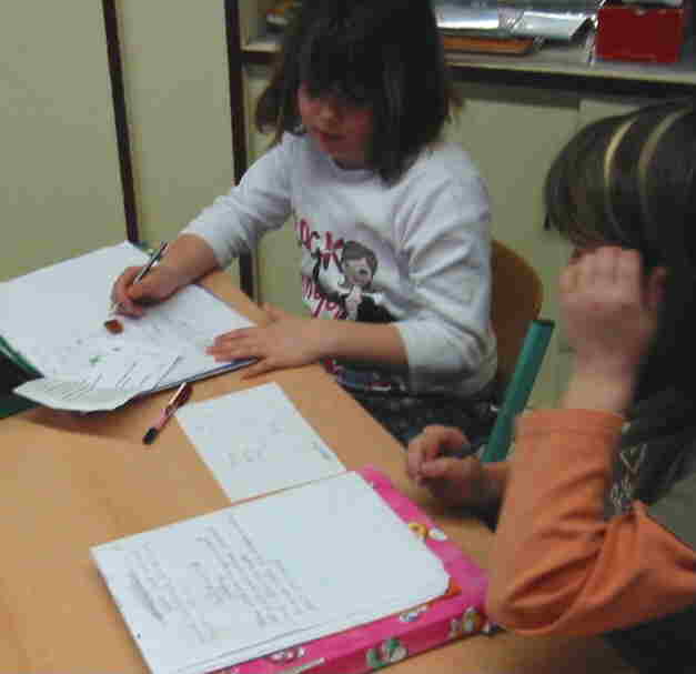Einer schreibt, einer liest "nur". An der Wandtafel sind zwei Lernangebote, ein informativer Text zum Abschreiben und Nebensätze, denen noch ein Hauptsatz(die Hauptsache) fehlt |