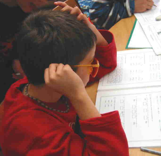 Direkt neben ihm arbeitet eine Fünfer-Gruppe mit Steckwürfeln. Seine Konzentration ist nicht beeinträchtigt dadurch. Wie man sehen kann... |