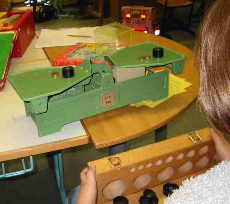An der Tafel steht "wiegen". Die Balkenwaage ist im Schrank, der CVK-Koffer mit Waagen unter meinem Tisch. |